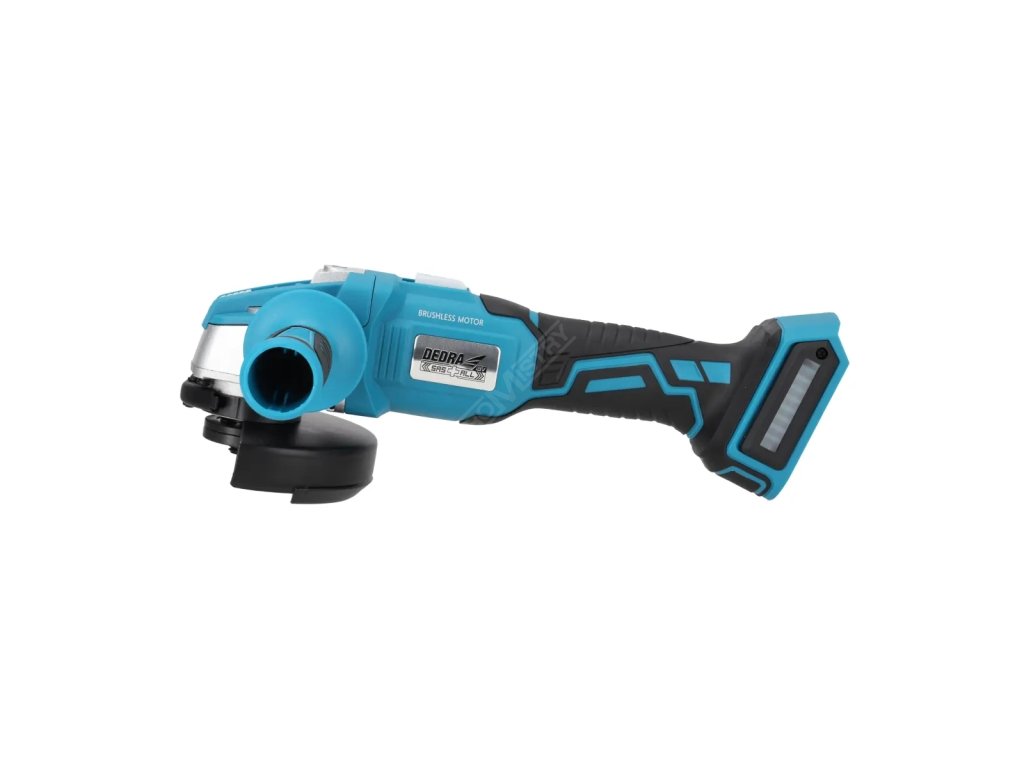Tento nástroj je určen k řezání a broušení. Bezkartáčový motor brusky dosahuje rychlosti 8500 ot/min a pracuje s kotouči 125 mm a 115 mm. Bruska je vybavena bezpečným vypínačem, který je určen k přerušení napájení, když je zařízení pod příliš velkým tlakem na zpracovávaný materiál, což by mohlo zařízení poškodit nebo přehřát. Rychlý montážní systém štítu, dvoupolohová boční rukojeť a pogumovaná rukojeť, stejně jako prodloužené pouzdro výrazně zlepšují komfort používání zařízení. Klíč pro výměnu disku byl umístěn v boční rukojeti, díky čemuž jej má uživatel vždy po ruce, když je nutné vyměnit disk nebo jiný pracovní hrot. Pouzdro je vyrobeno z nylonu s příměsí skleněného vlákna, díky čemuž se zvýšila odolnost proti mechanickému poškození a UV záření. Ergonomii a komfort práce zvyšuje: nízká hmotnost zařízení a pogumovaná rukojeť. Doporučená baterie pro práci s akumulátorovou úhlovou bruskou je 4,0 Ah DED7034 nebo 5,0 Ah DED7035.