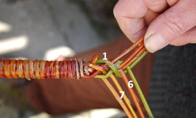 8. Pleteme podle obrázku: Proutek, který je nahoře (1)jedné strany, vložíme mezi proutky na druhou stranu (6 a 7) a spodem ho vrátíme zpět na jeho původní stranu, ale úplně dospodu (na místo proutku č. 4).