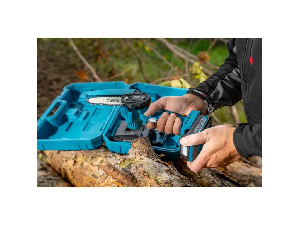 Mini řetězová pila DEDRA DED6984 Akumulátor o kapacitě 2 Ah DED7032Nabíječka pro akumulátory DED7038