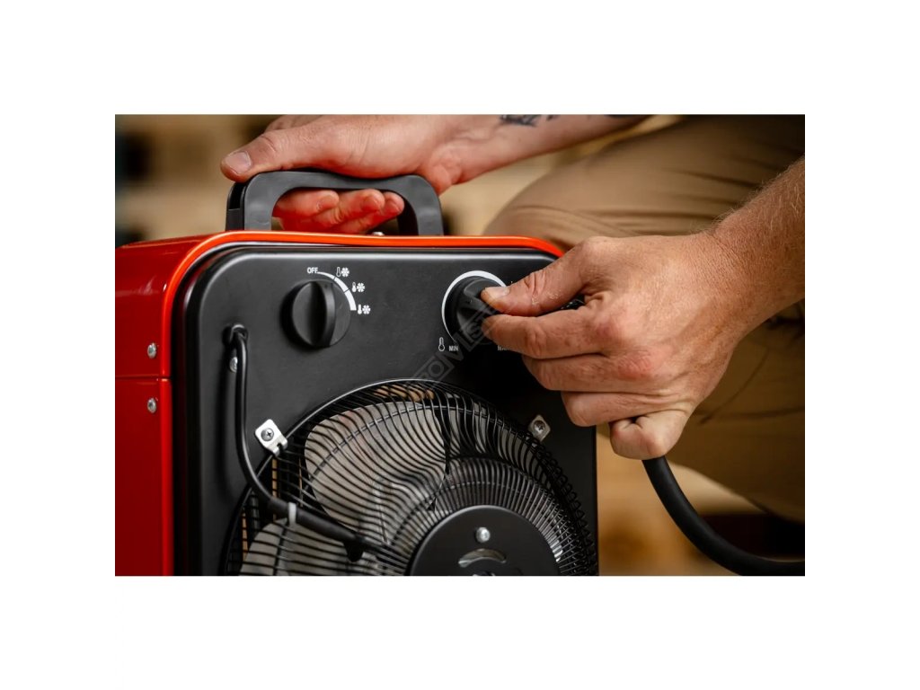 Elektrický ohřívač DED9924B je zařízení určené pro vnitřní použití. Používá se k vytápění obytných a technických místností, jako jsou sklepy, garáže, dílny, výrobní haly, sklady atd. Zařízení je určeno k použití jako přídavný zdroj tepla, nemůže být hlavním zdrojem tepla. Zařízení má ochranu proti přehřátí, je navrženo pro nepřetržitý provoz a během provozu neprodukuje nečistoty ani zápach. Byl použit axiální ventilátor a odolné nízkoteplotní ohřívače. Díky účinnému ventilátoru má zařízení velký průtok vzduchu. Ohřívač má zabudované teplotní čidlo, regulátor výkonu a termostat. Nastavením knoflíku teploty na minimum lze zařízení použít jako ventilátor bez funkce topení.