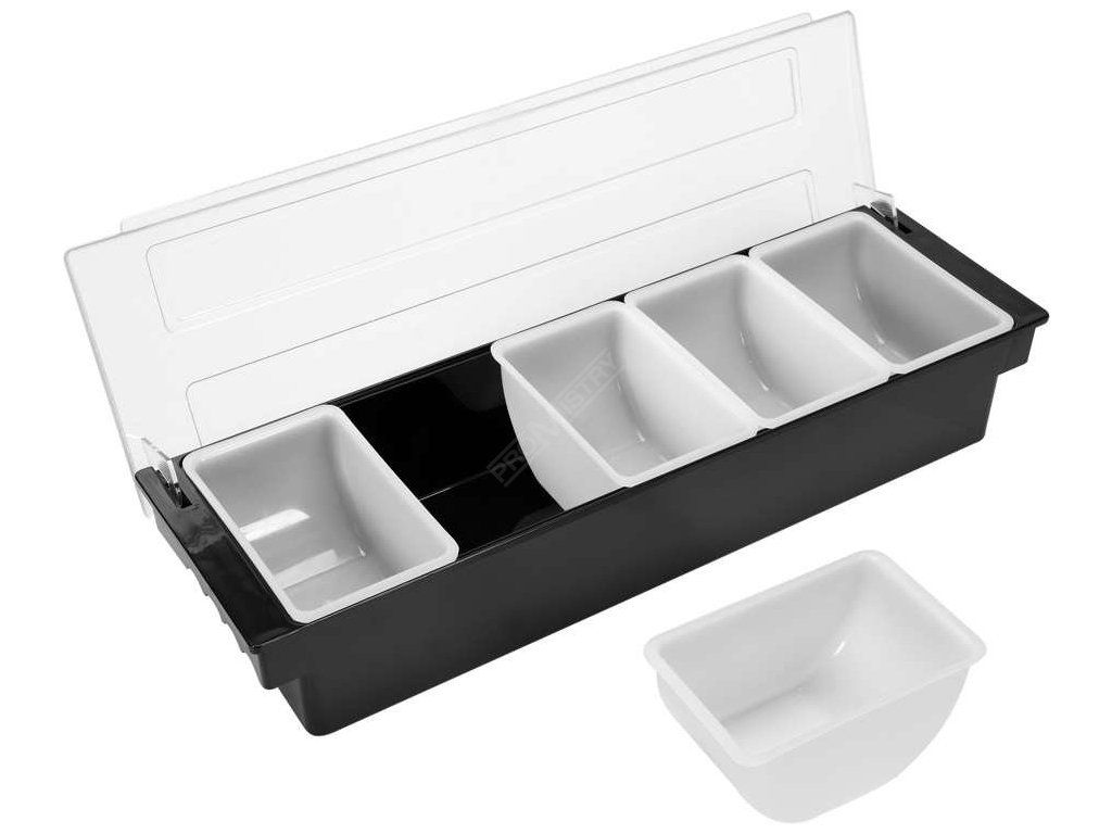 Má 5 výsuvných polypropylenových nádob. Kontejner je velmi praktický a funkční a je ideální pro bary a restaurace.
