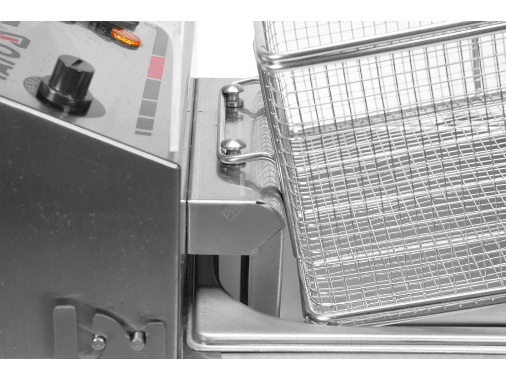 Fritéza je řízena potenciometrem umístěným na ovládacím panelu. Je možné nastavit provozní teplotu v rozmezí 60 ~ 200° C. Instalovaný přepínač je odolný proti stříkající vodě vám umožní vypnout zařízení bez odpojení napájecího kabelu ze sítě. Ovládací panel má navíc ochranný kryt z velmi odolného polykarbonátu, který panel chrání před olejem při smažení. Díky tomu je udržování fritézy v čistotě mnohem snazší. Odnímatelné topné těleso lze zavěsit na speciální držák v poloze, kde kapající olej jde zpět do nádrže. Fritéza má další bezpečnostní zařízení, které automaticky vypne ohřívač, když je vyjmuto z nádrže. Dodatečná ochrana jej chrání před přehřátím při teplotách nad 260° C.