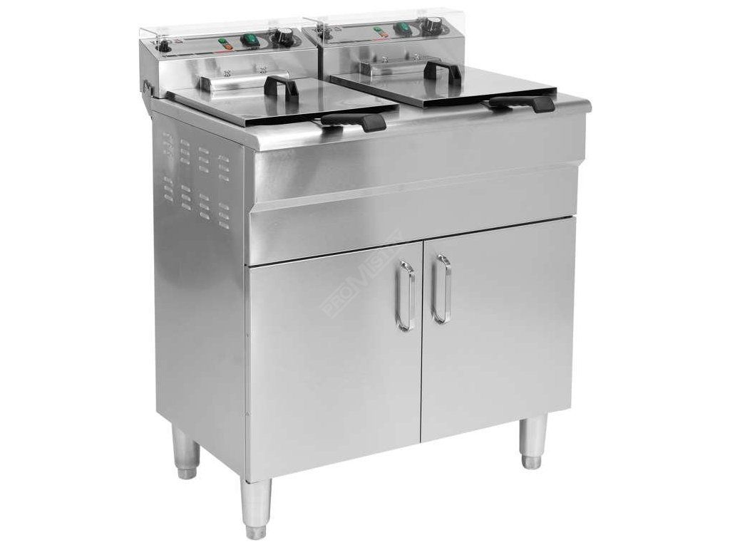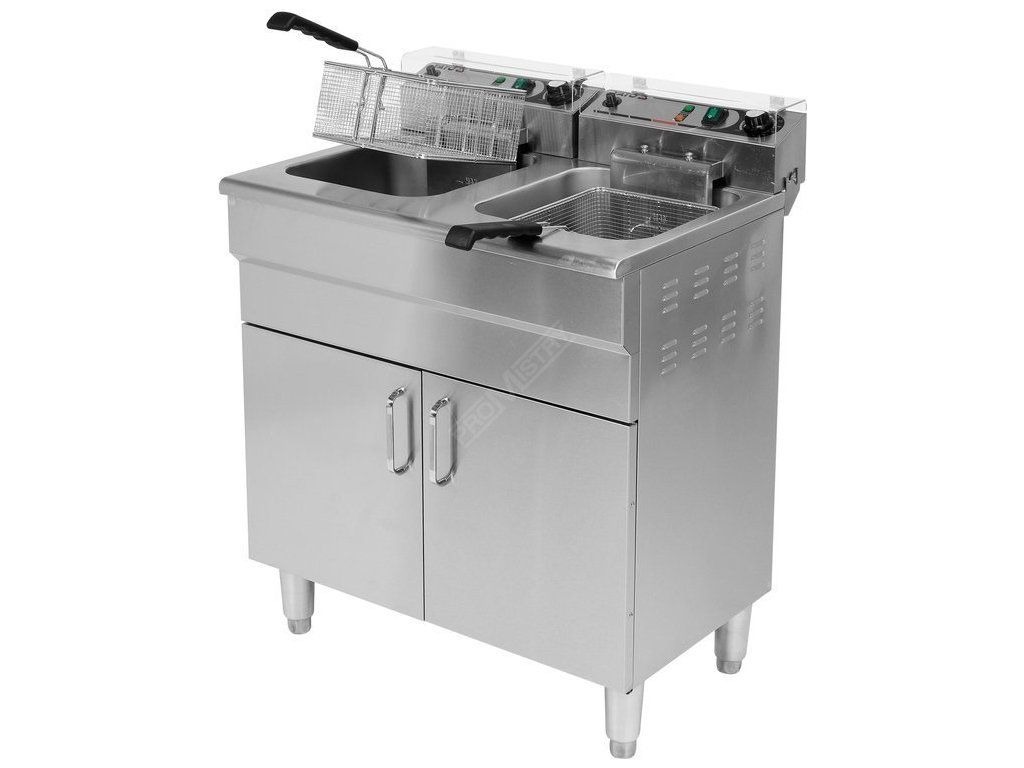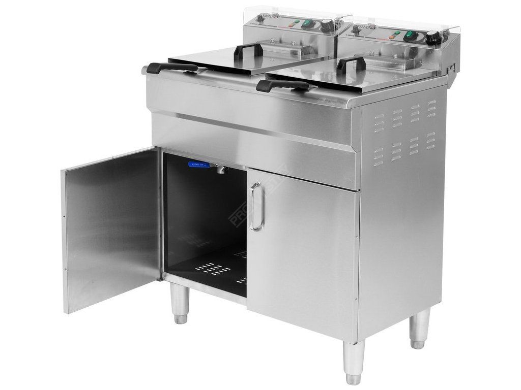 Volně stojící fritéza má ve spodní části skříňku o rozměrech 370 x 680 x 390 mm s uzamykatelnými dvířky. Uvnitř skříně, ve výšce 32 cm, jsou dva vypouštěcí kohouty, které vám umožňují vypustit olej z nádrží. Toto je obzvláště užitečná funkce, která umožňuje velmi rychlou výměnu oleje. Kromě toho umožňuje nalévání starého oleje přímo do kanystru, čímž se minimalizuje riziko jeho rozlití. Skříň je namontována na čtyřech nohách s výškovým nastavením v rozmezí 13,5 / 16 cm.
