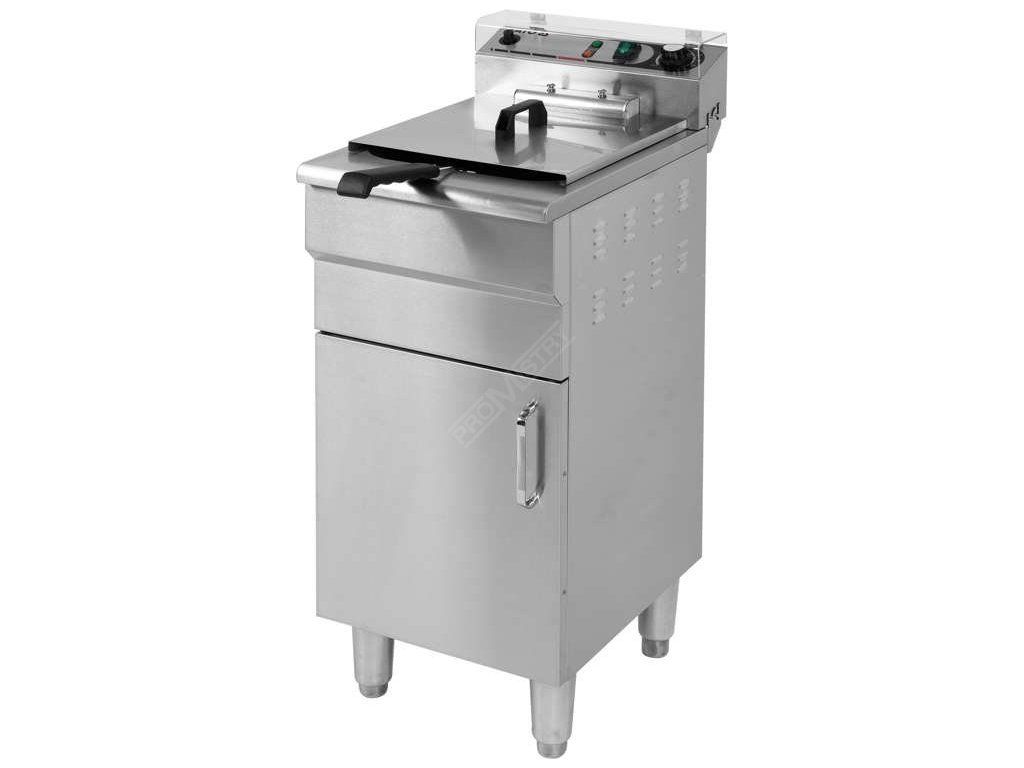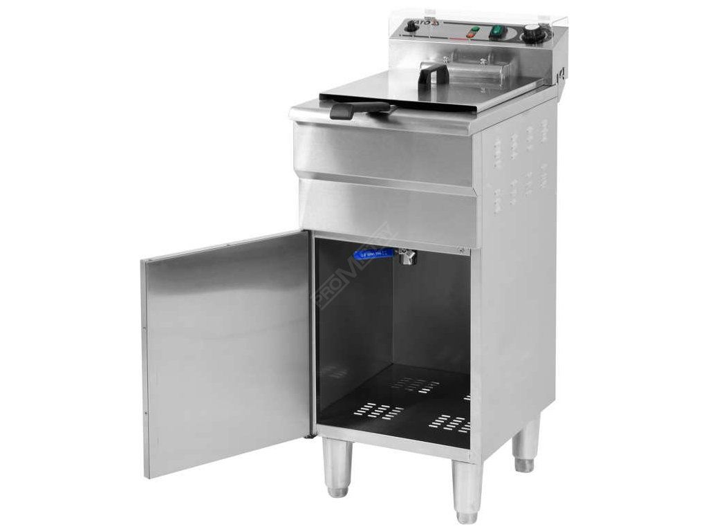 Volně stojící fritéza má ve spodní části skříňku o rozměrech 370 x 315 x 390 mm s uzamykatelnými dvířky. Uvnitř skříně, ve výšce 32 cm, je vypouštěcí kohout, který vám umožňuje vypustit olej z nádrže. Toto je obzvláště užitečná funkce, která umožňuje velmi rychlou výměnu oleje. Kromě toho umožňuje nalévání starého oleje přímo do kanystru, čímž se minimalizuje riziko jeho rozlití. Skříň je namontována na čtyřech nohách s výškovým nastavením v rozmezí 13,5 / 16 cm.