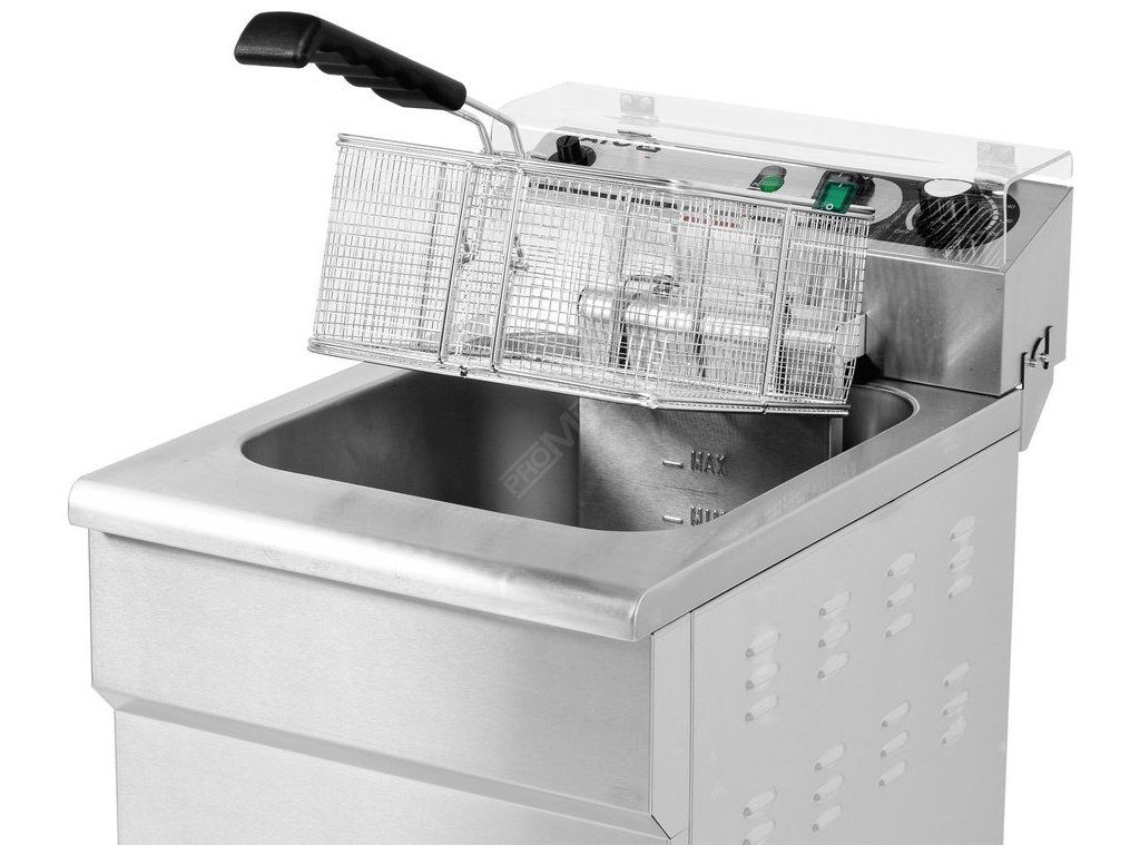 Fritéza je řízena potenciometrem umístěným na ovládacím panelu. Je možné nastavit provozní teplotu v rozmezí 60 ~ 200° C. Instalovaný přepínač je odolný proti stříkající vodě vám umožní vypnout zařízení bez odpojení napájecího kabelu ze sítě. Ovládací panel má navíc ochranný kryt z velmi odolného polykarbonátu, který panel chrání před olejem při smažení. Díky tomu je udržování fritézy v čistotě mnohem snazší. Odnímatelné topné těleso lze zavěsit na speciální držák v poloze, kde kapající olej jde zpět do nádrže. Fritéza má další bezpečnostní zařízení, které automaticky vypne ohřívač, když je vyjmuto z nádrže. Dodatečná ochrana jej chrání před přehřátím při teplotách nad 260° C.