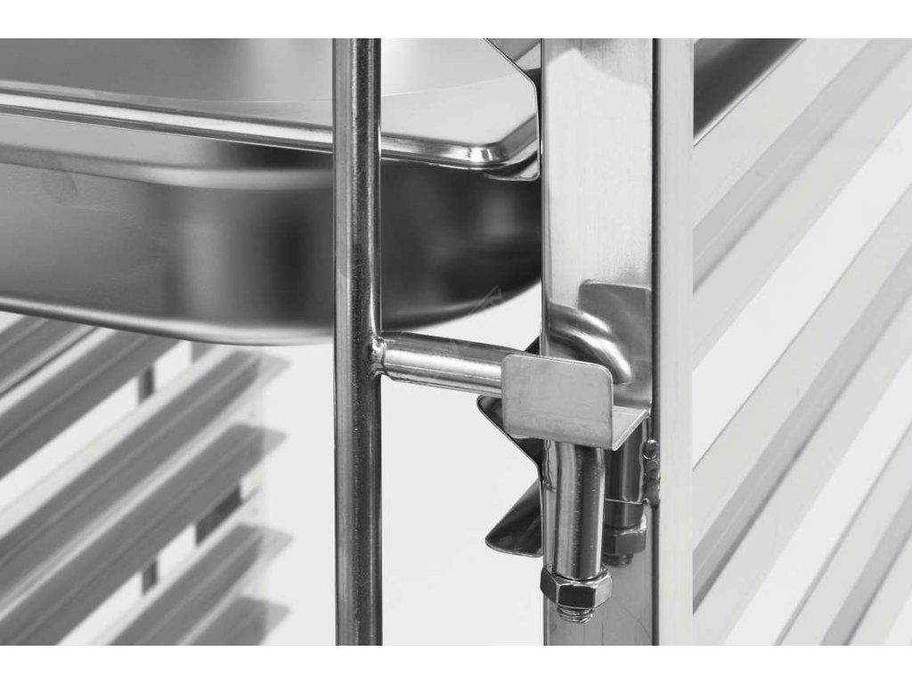 Vodítka rozmístěná každých 80 mm se speciálním designem ve tvaru písmene L zaručují stabilní držení podnosů a desek a velkou plochu pro přepravované produkty. Na obou stranách vozíku jsou snadno použitelné zámky, které chrání kontejnery před vysunutím během přepravy.