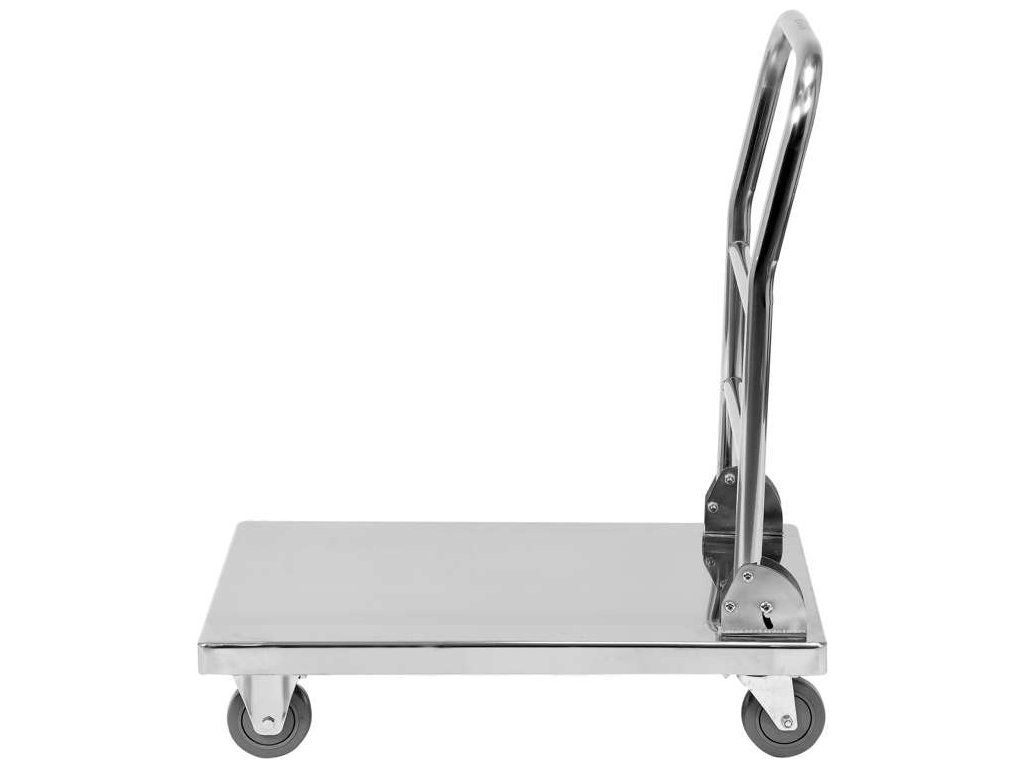 Rozměry vozíku umožňují snadné manévrování v úzkých uličkách a usnadňuje přístup do skladovacích prostor. Použití vysoce kvalitní nerezové oceli zaručuje zvýšenou odolnost proti poškození a poškrábání. Proto je náš produkt vhodný k intenzivnímu používání po mnoho let. Povrchy z nerezové oceli navíc usnadňují udržování vozíku v čistotě. Sklopná rukojeť usnadňuje přenášení a skladování produktu, například pod odkládacími policemi, takže vozík nezabírá pracovní prostor skladu.