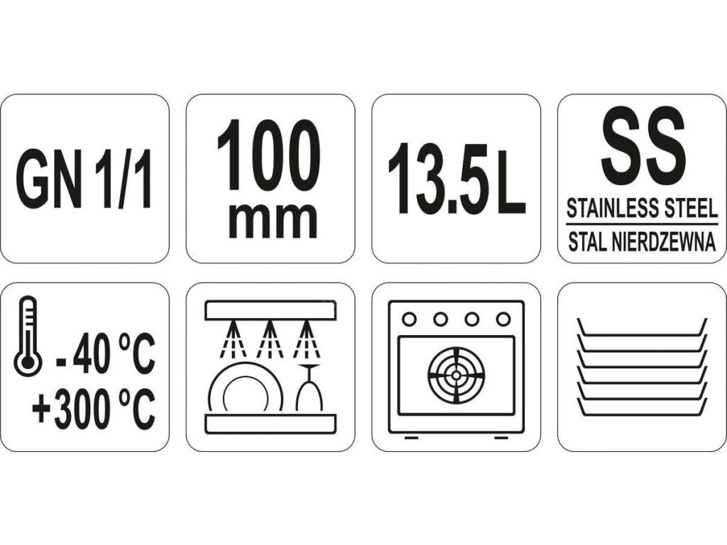 Gastronomická nerezová nádoba GN 1/1 100 mm je profesionální nádoba YATO z nerezové oceli, rozměry 1/1, 100 mm, objem 13,5 l.