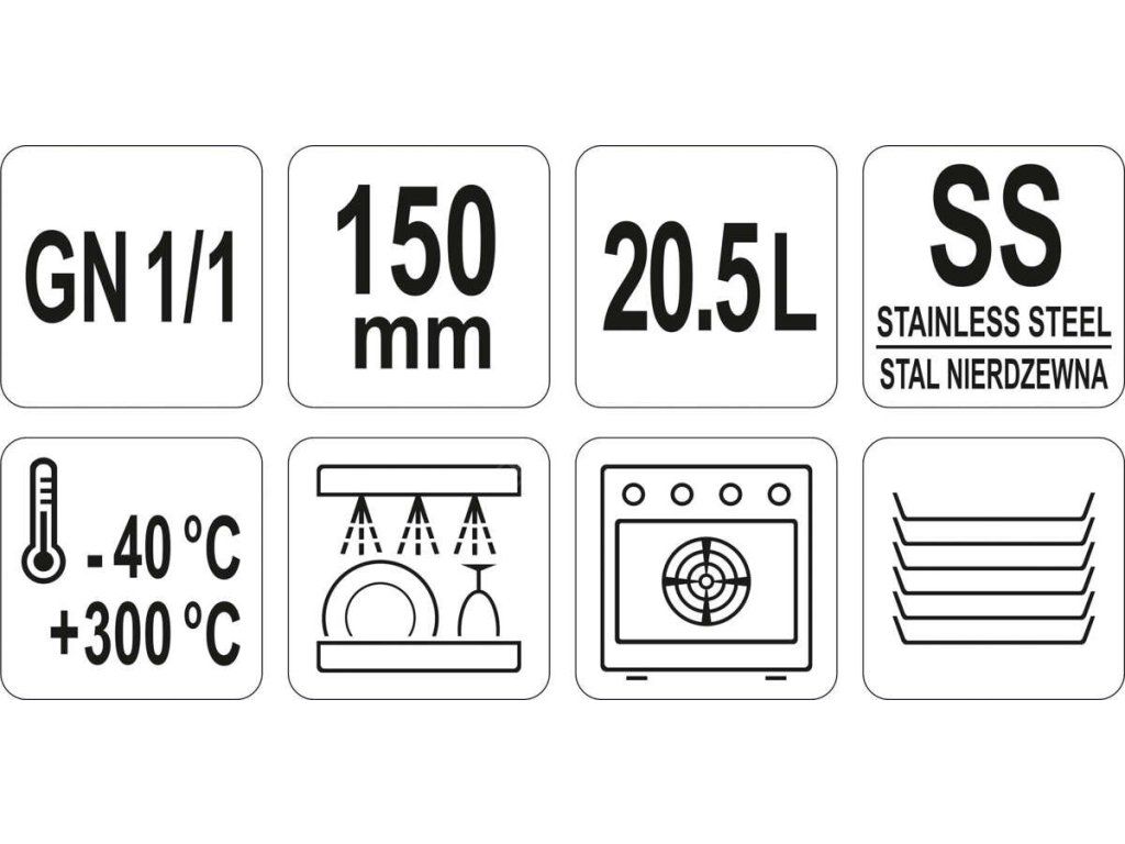 Gastronomická nerezová nádoba GN 1/1 150 mm je profesionální nádoba YATO z nerezové oceli, rozměry 1/1, 150 mm, objem 20,5 l.