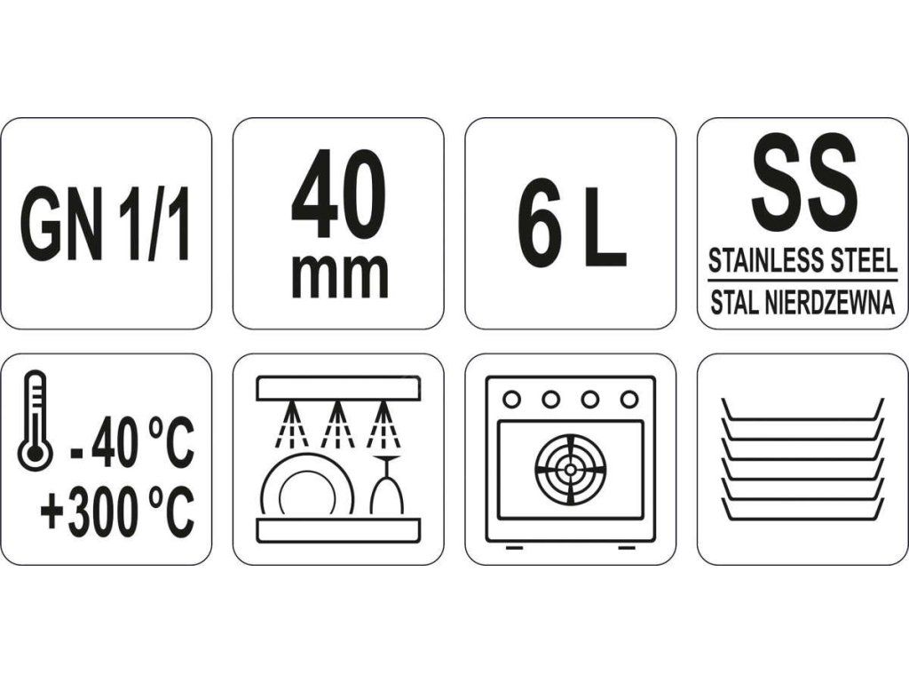Gastronomická nerezová nádoba GN 1/1 40mm je profesionální nádoba YATO z nerezové oceli, rozměry 1/1, 40 mm, objem 6 l.