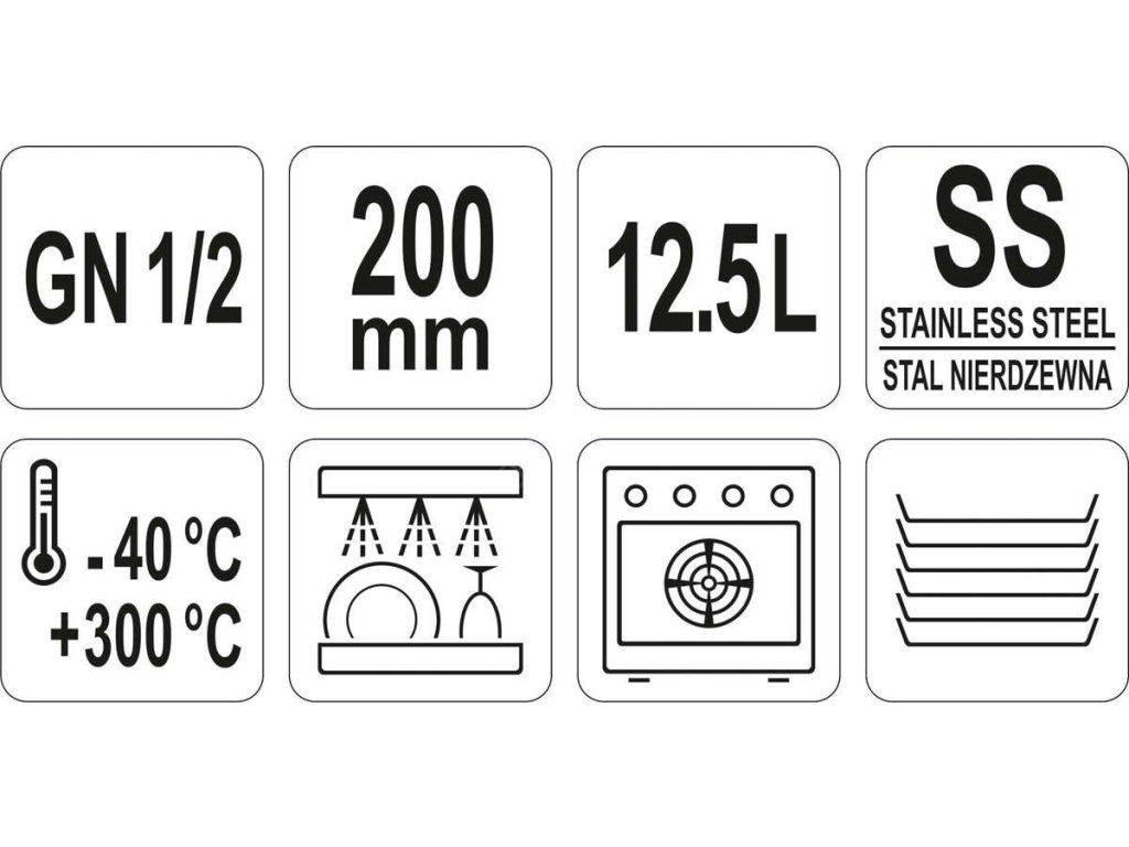 Gastronomická nerezová nádoba GN 1/2 200 mm je profesionální nádoba YATO z nerezové oceli, rozměry 1/2, 200 mm, objem 12,5 l.