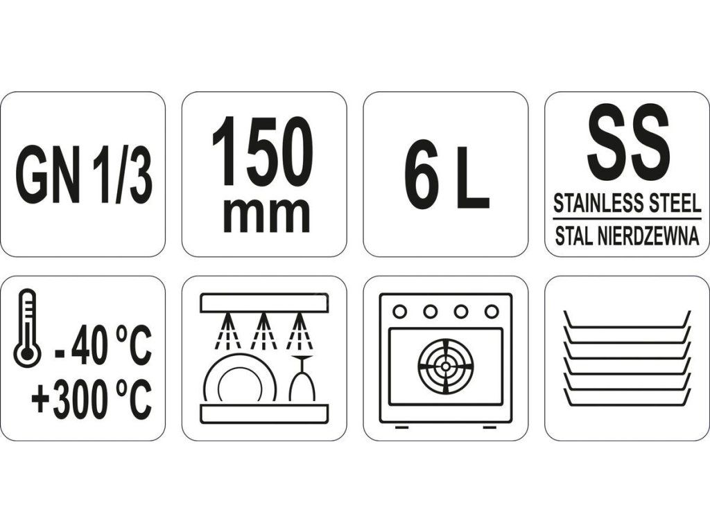 Gastronomická nerezová nádoba GN 1/3 150 mm je profesionální nádoba YATO z nerezové oceli, rozměry 1/3, 150 mm, objem 6 l.