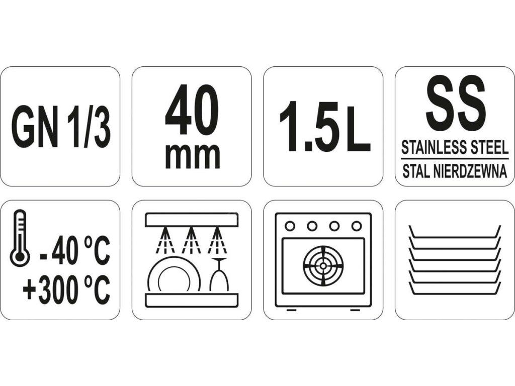 Gastronomická nerezová nádoba GN 1/3 40 mm je profesionální nádoba YATO z nerezové oceli, rozměry 1/3, 40 mm, objem 1,5 l.