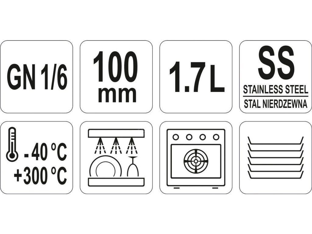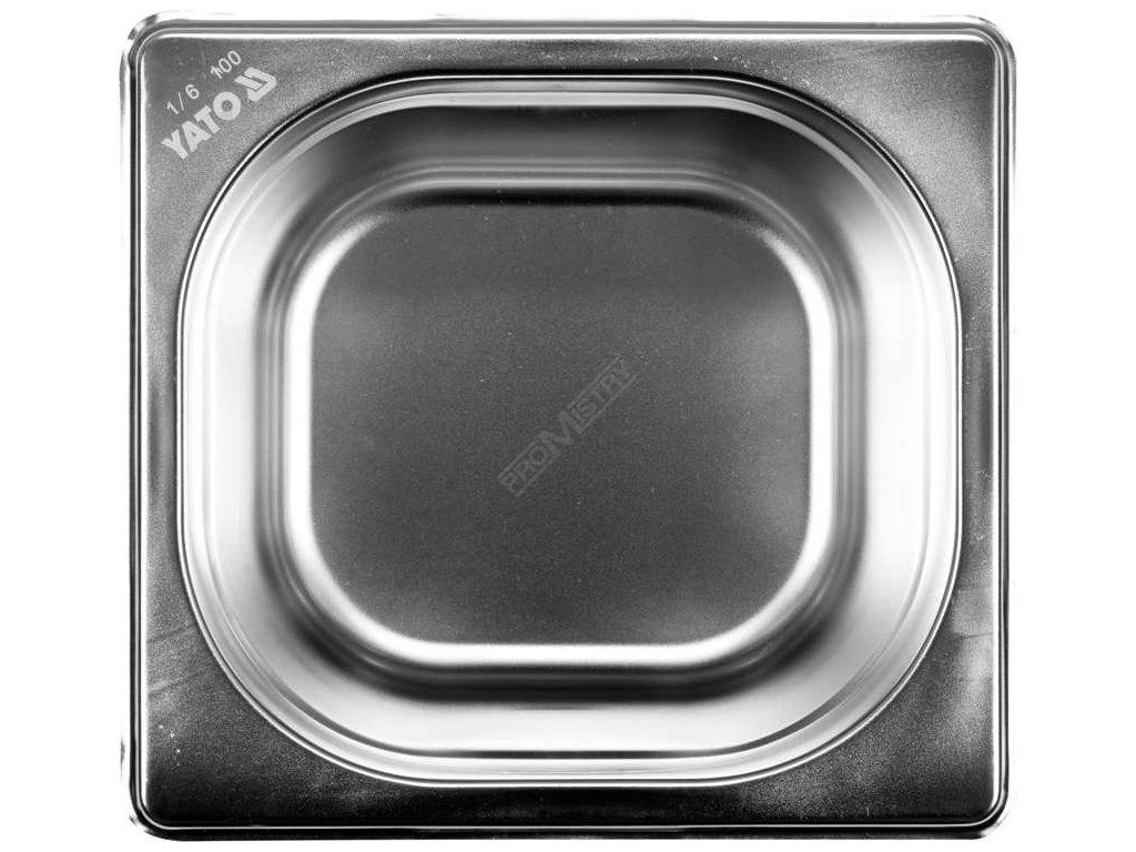 Gastronomická nerezová nádoba GN 1/6 100 mm je profesionální nádoba YATO z nerezové oceli, rozměry 1/6, 100 mm, objem 1,7 l.