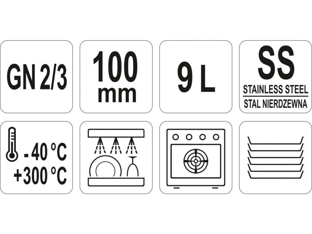 Gastronomická nerezová nádoba GN 2/3 100 mm je profesionální nádoba YATO z nerezové oceli, rozměry 2/3, 100 mm, objem 6,9 l.