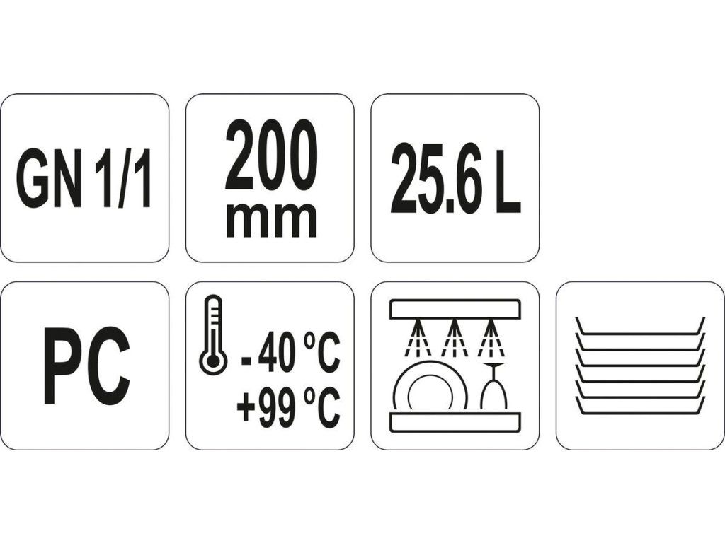 Gastronomická polykarbonátová nádoba GN 1/1 200 mm je profesionální nádoba YATO z polykarbonátu o objemu 25,6 l. Nádoby YATO jsou vyrobeny z kvalitního polykarbonátu, který se vyznačuje velmi vysokou trvanlivostí a odolností vůči mechanickému poškození, což zaručuje velmi dlouhou životnost.