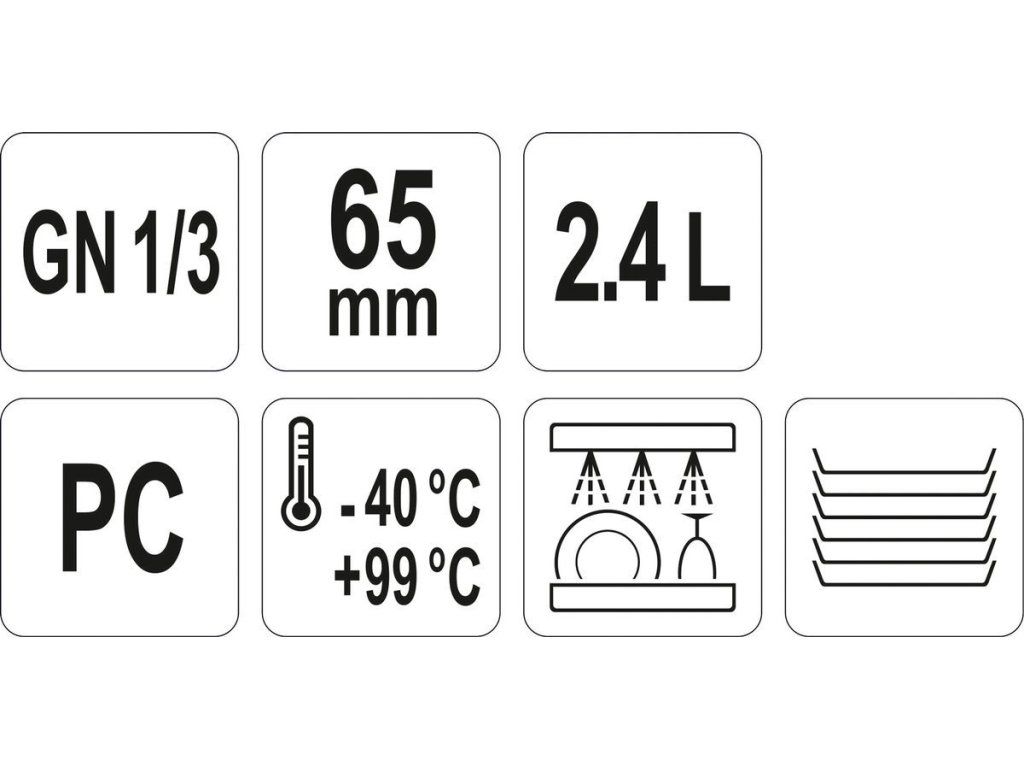 Gastronomická polykarbonátová nádoba GN 1/3 65 mm je profesionální nádoba YATO z polykarbonátu o objemu 2,4 l. Nádoby YATO jsou vyrobeny z kvalitního polykarbonátu, který se vyznačuje velmi vysokou trvanlivostí a odolností vůči mechanickému poškození, což zaručuje velmi dlouhou životnost.