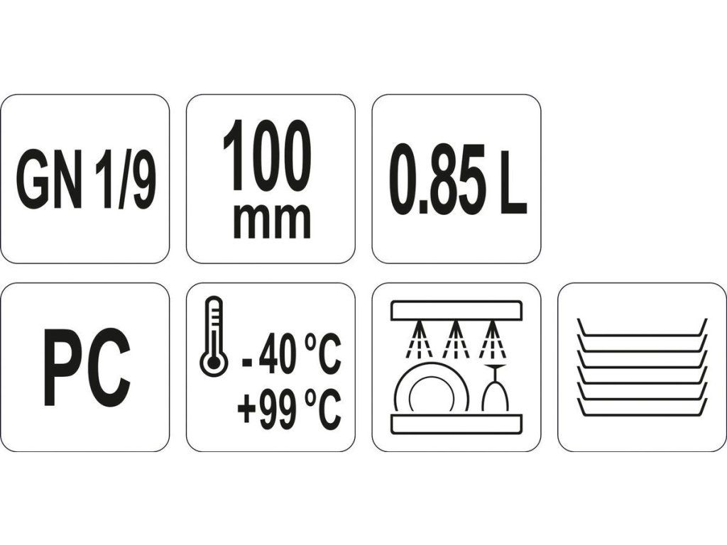 Gastronomická polykarbonátová nádoba GN 1/9 100 mm je profesionální nádoba YATO z polykarbonátu o objemu 0,85 l. Nádoby YATO jsou vyrobeny z kvalitního polykarbonátu, který se vyznačuje velmi vysokou trvanlivostí a odolností vůči mechanickému poškození, což zaručuje velmi dlouhou životnost.