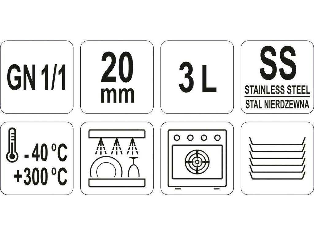 Perforovaná nerezová nádoba GN 1/1 20 mm je profesionální nádoba YATO z nerezové oceli, rozměry 1/1, 20 mm, objem 3 l.
