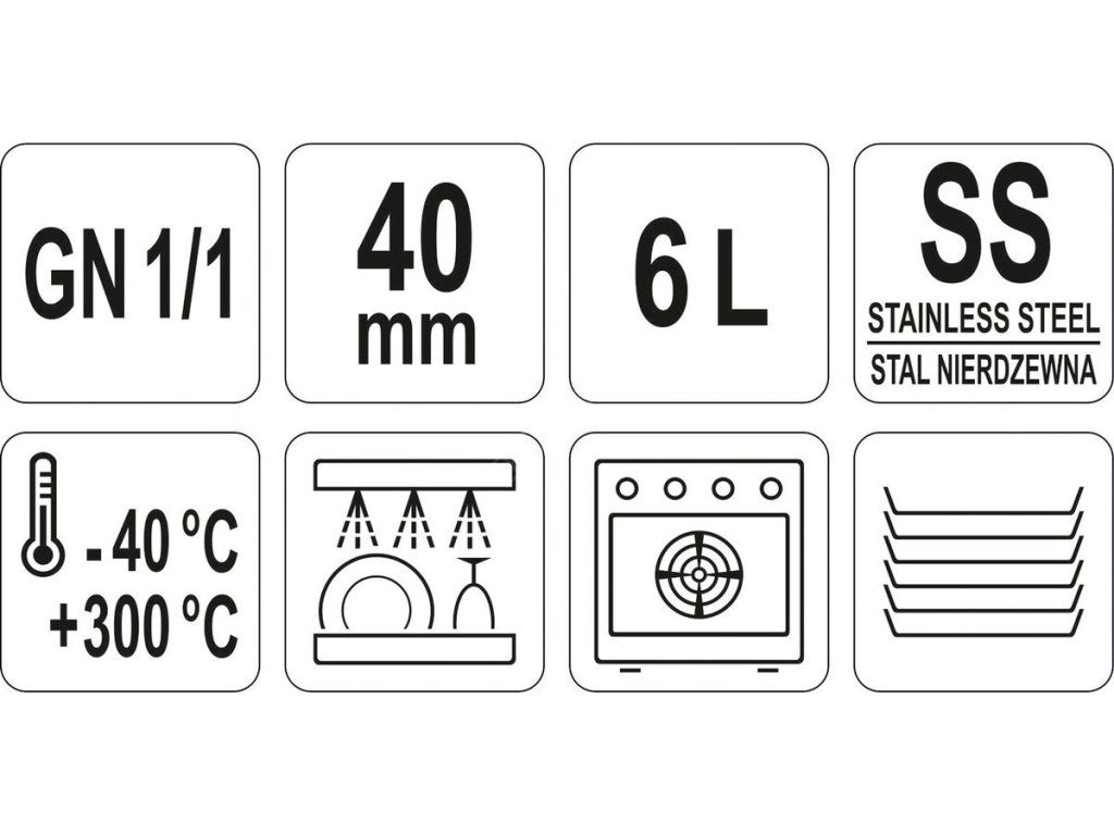 Perforovaná nerezová nádoba GN 1/1 40 mm je profesionální nádoba YATO z nerezové oceli, rozměry 1/1, 40 mm, objem 6 l.