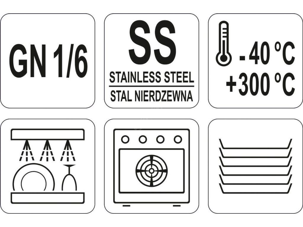 Víko je určeno pro nádobu YATO Proffesional Kitchen Equipment v souladu s normou GASTRO NORM PN-EN 631-1: 1996. Víka jsou vyrobeny z nerezové oceli nejvyšší kvality 201, s matným a hladkým povrchem.