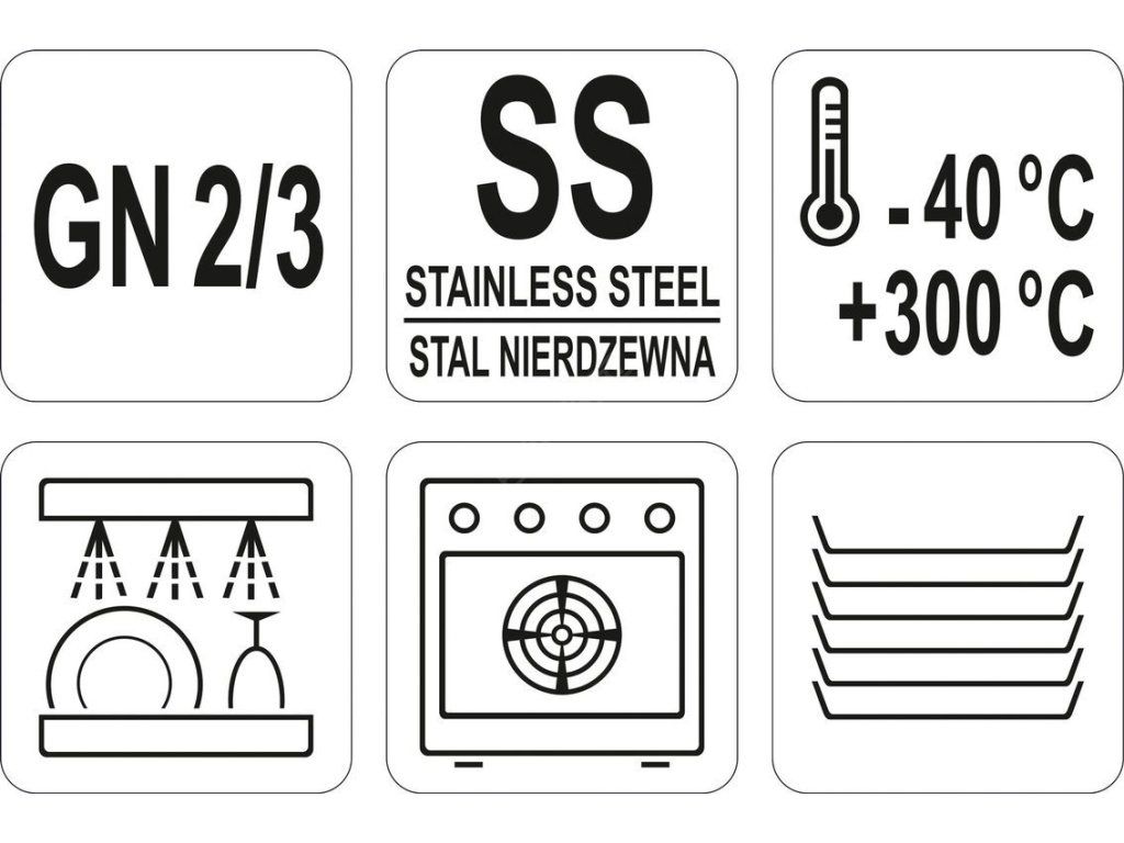 Víko je určeno pro nádobu YATO Proffesional Kitchen Equipment v souladu s normou GASTRO NORM PN-EN 631-1: 1996. Víka jsou vyrobeny z nerezové oceli nejvyšší kvality 201, s matným a hladkým povrchem.