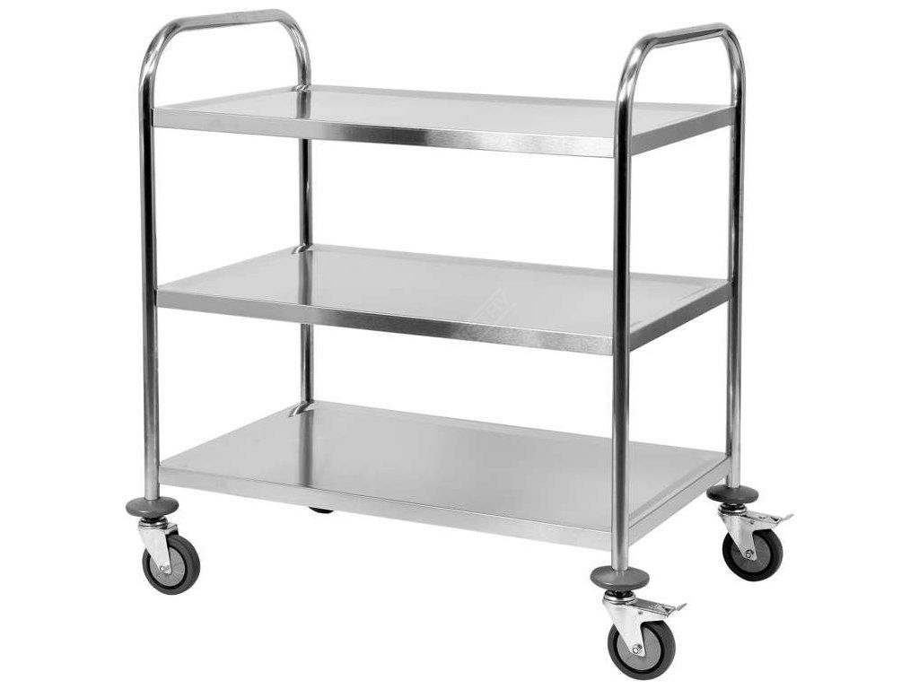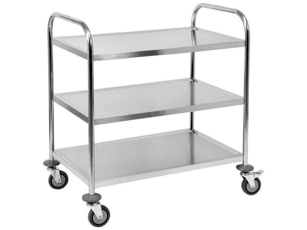 Tři velké police jsou zakončeny speciální hranou, která zabraňuje uklouznutí přepravovaných produktů během přepravy. Všechny hrany vozíku jsou zaoblené, což navíc zvyšuje bezpečnost při používání. Rozteč mezi policemi je 270 mm.