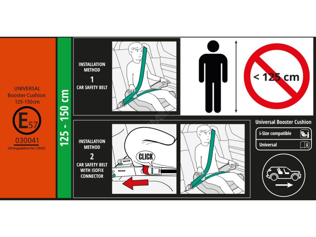 Dětský podsedák s uchycením ISOFIX je homologovaný podle evropských norem (ECE R129) a je určen pro děti s výškou 125 - 150 cm. Podsedák je dodáván s vysoce kvalitními univerzálními adaptéry ISOFIX vyrobenými z odolného plastu, což usnadňuje instalaci a montáž.