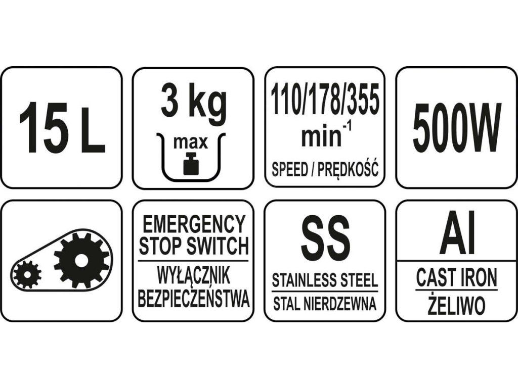 Mísa se spouští pomocí páky, která umožňuje její demontáž, vyložení a mytí. Mixér má dodatečnou ochranu proti spuštění se spuštěným bubnem. Dodatečnou ochranou je také automatické vypnutí zařízení při pokusu o otevření ochranného krytu.