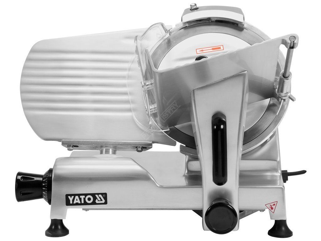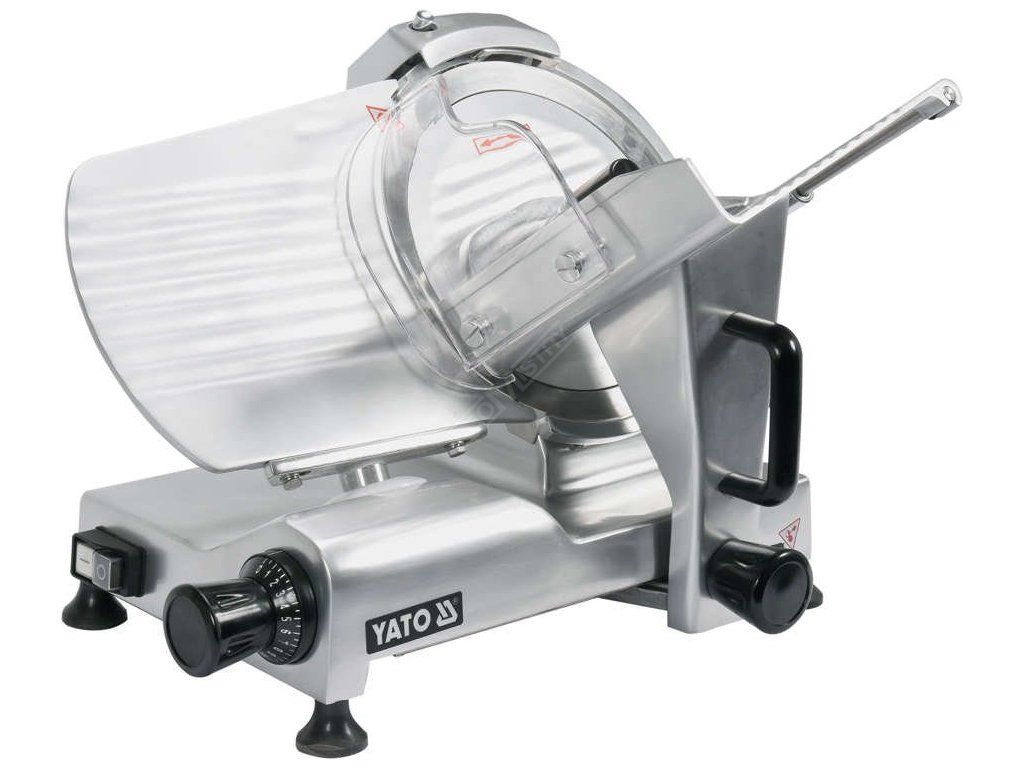 Kráječ na uzeniny a sýry. Základna je vyrobena z vysoce kvalitní slitiny hliníku s lakovaným šedým povrchem, velmi snadno se čistí a udržuje v čistotě. Další výhodou kráječe YATO je odnímatelný podavač, který lze rychle odšroubovat, což výrazně usnadňuje přístup do těžko přístupných zákoutí a usnadňuje jejich čištění od zbytků řezaných produktů.