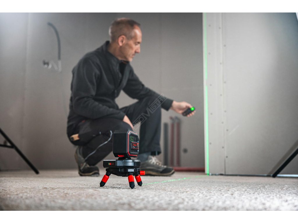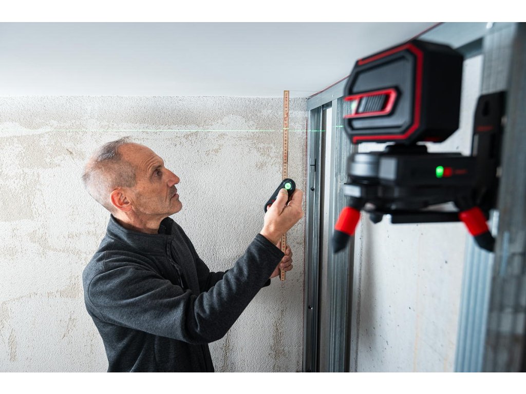 Pomocí dálkového ovládání lze laserové čáry bezkontaktně vyrovnávat až do vzdálenosti 30 metrů. Dálkové ovládání umožňuje otáčení laseru po a proti směru hodinových ručiček třemi volitelnými rychlostními stupni, díky čemuž lze docílit rychlého a na milimetr přesného vyrovnání svislé čáry. Vodorovnou čáru lze vyrovnat na milimetr přesně, případně jedním stiskem tlačítka zvednout nebo snížit na maximální, resp. minimální úroveň nastavení o 2 cm. Takto vznikají přesné výsledky s minimálními časovými náklady. Zcela bez nutnosti dodatečného seřizování na přístroji. Integrovaný li-ion akumulátor lze dobíjet přes konektor USB-C.