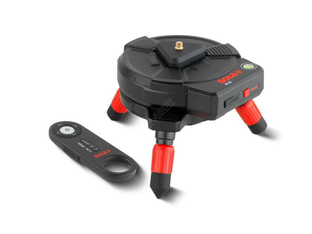 Motorizovaná základna pro nastavení laseru RCB umožňuje otáčení laseru o 360° po i proti směru hodinových ručiček a usnadňuje tak precizní vyrovnání svislé laserové čáry. Otáčení lze provádět ručně otočným ovladačem na základně nebo dálkovým ovládáním. Pomocí nivelační platformy lze laser zvednout nebo snížit o 2 cm a dosáhnout tak přesného vyrovnání vodorovné čáry. Nivelační platformu se závitem 1/4“ lze s adaptérem využít i pro upevnění laserových přístrojů se závitem 5/8“. Základna pro nastavení laseru RCB je vybavena třemi výškově nastavitelnými otočnými nohami a kruhovou libelou pro správnou nivelaci základny.