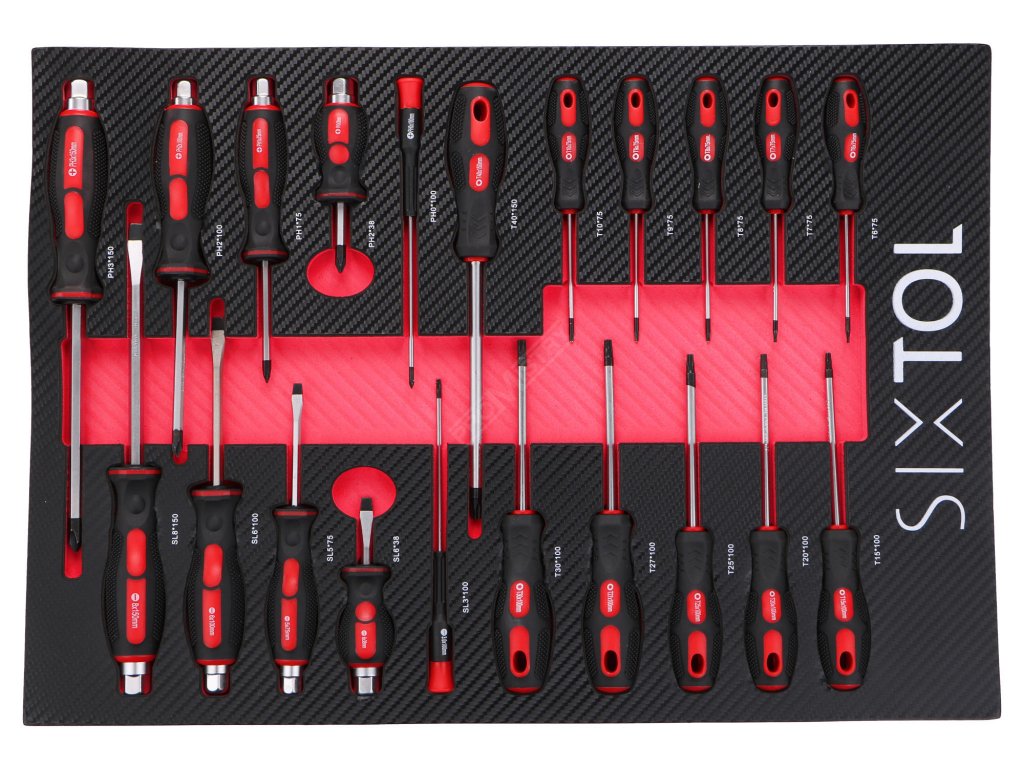 - 11x Klasické šroubováky: T6 × 75 mm; T7 × 75 mm; T8 × 75 mm; T9 × 75 mm; T10 × 75 mm; T15 × 100 mm; T20 × 100 mm; T25 × 100 mm; T27 × 100 mm; T30 × 100 mm; T40 × 150 mm