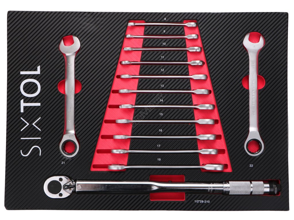 - 2. Šuplík - 14x Ráčnové klíče a momentový klíč - 13x Ráčnové klíče: 8; 9; 10; 11; 12; 13; 14; 15; 16; 17; 19; 21; 22 mm