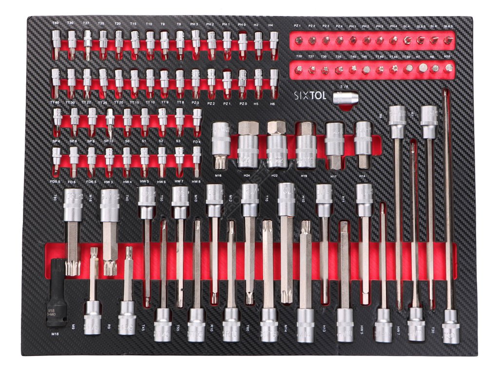 - 13x 1/2" bitové hlavice 140 mm: Torx: T40, T45, T50, T55, T60, T70; Spline: M10, M12, M14; Imbus: H10, H11, H13; R10