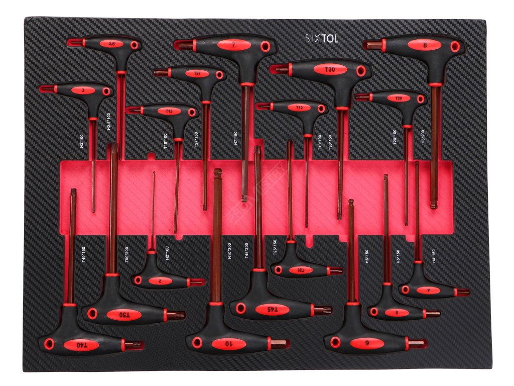 - 6. Šuplík – 18x T-klíče (materiál S2) - T-klíče TORX (T-handle wrench): T40 × 150 mm; T45 × 200 mm; T30 × 150 mm; T50 × 200 mm; T10 × 100 mm; T27 × 150 mm; T15 × 100 mm; T20 × 100 mm; T25 × 150 mm