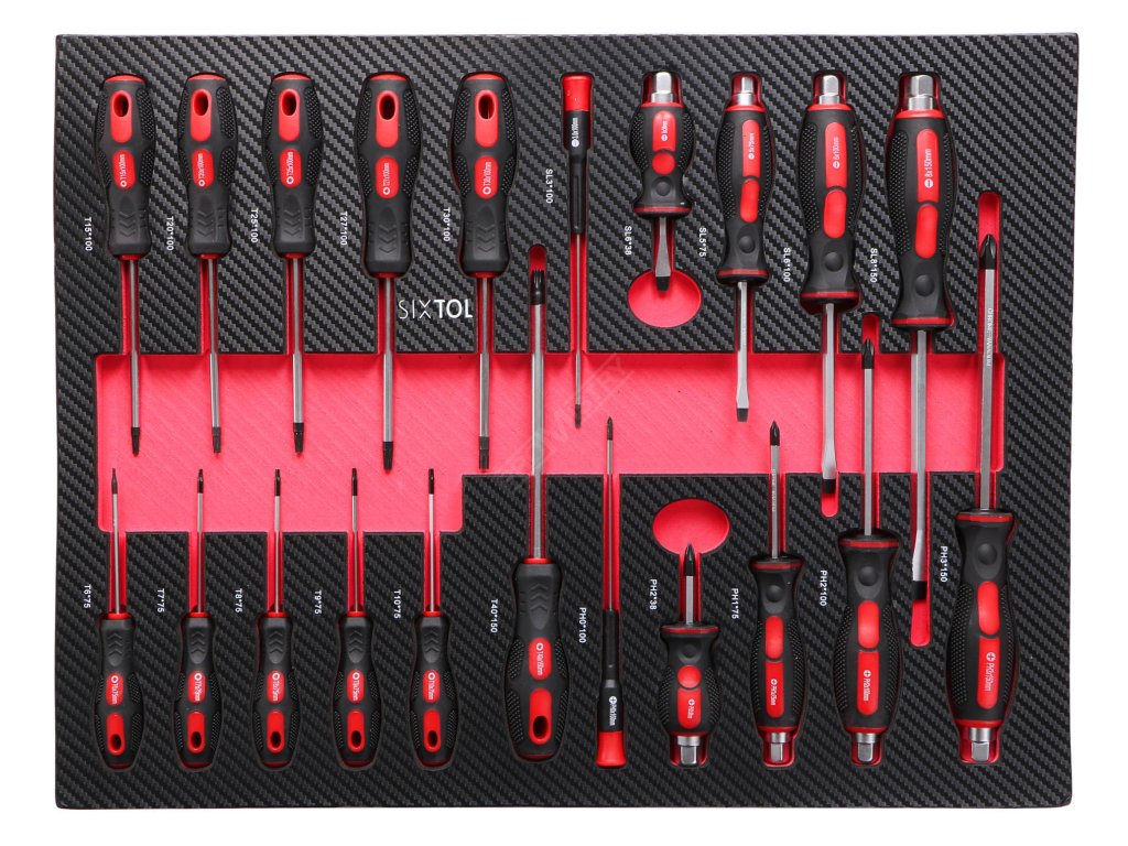- 11x Klasické šroubováky: T6 × 75 mm; T7 × 75 mm; T8 × 75 mm; T9 × 75 mm; T10 × 75 mm; T15 × 100 mm; T20 × 100 mm; T25 × 100 mm; T27 × 100 mm; T30 × 100 mm; T40 × 150 mm
