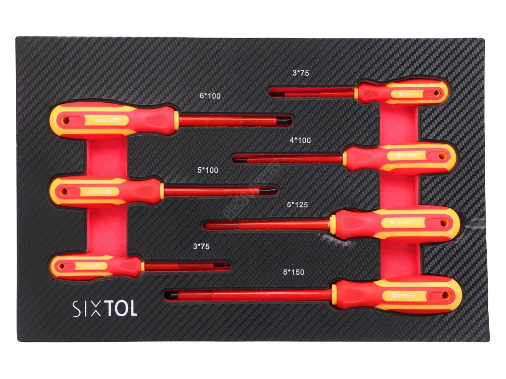 - 8. Šuplík – 7x izolované (elektrikářské) šroubováky - 3x Křížové: 3 × 75 mm; 5 × 100 mm; 6 × 100 mm