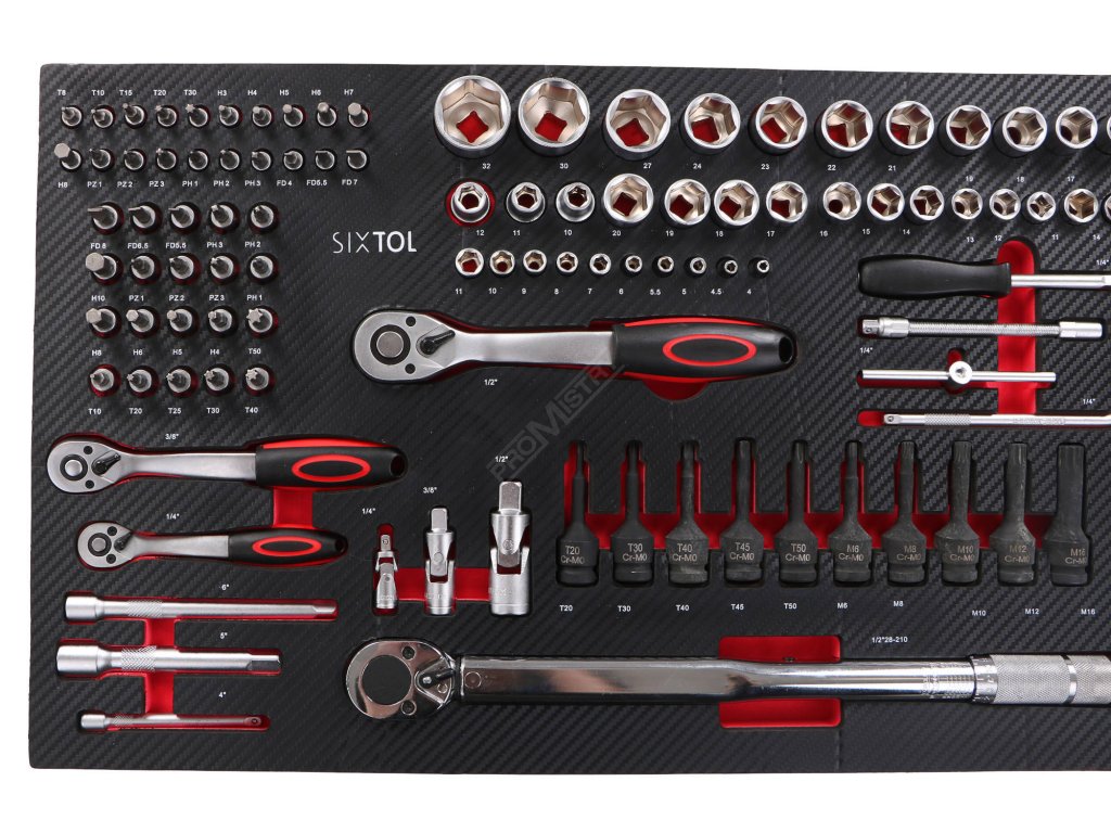 - 17x Krátké 1/2" šestihranné hlavice: M10, M11, M12, M13, M14, M15, M16, M17, M18, M19, M21, M22, M23, M24, M27, M30, M32