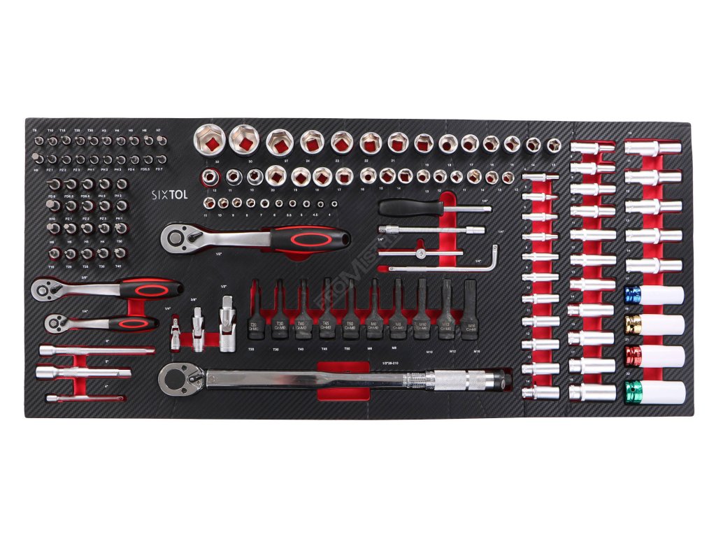 - 1. Šuplík – 136x Nástrčné hlavice, bity, ráčny, prodloužení a momentový klíč - 4x Barevné nástrčné hlavice 1/2": 17; 19; 21; 22 mm
