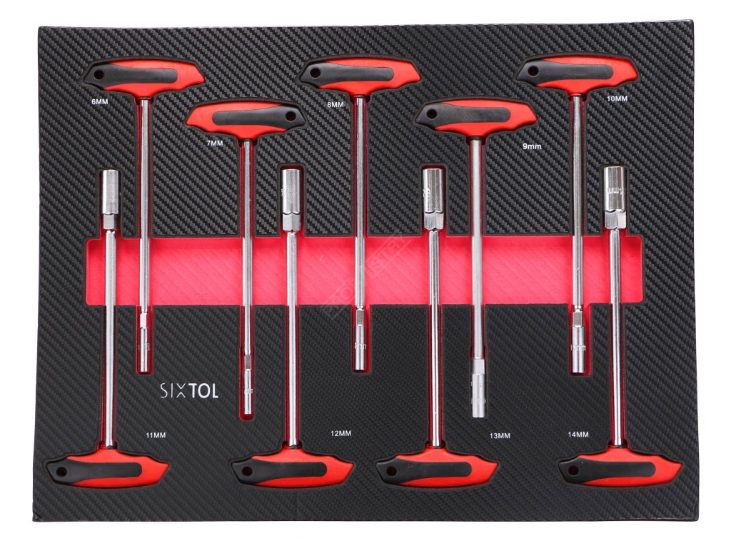 - 4. Šuplík – 9x T-ráčnové nástrčné klíče (T-bar socket set) - Velikosti: 6; 7; 8; 9; 10; 11; 12; 13; 14 mm
