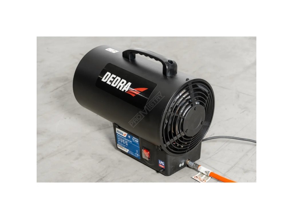 Plynový ohřívač DED9941A je zařízení určené pro vnitřní použití. Používá se k vytápění nebytových prostor, jako jsou dílny, sklady, výrobní haly, skleníky nebo při rekonstrukcích a stavebních pracích. Topení je poháněno plynným propan-butanem (G30). Přístroj lze používat pouze v místnostech s účinným větráním, kovové pouzdro se ani po delší době provozu neohřívá. Tepelná ochrana zajišťuje bezpečný provoz. Sada obsahuje speciální redukci a hadici. Robustní rukojeť usnadňuje přenášení a přepravu.