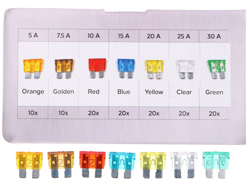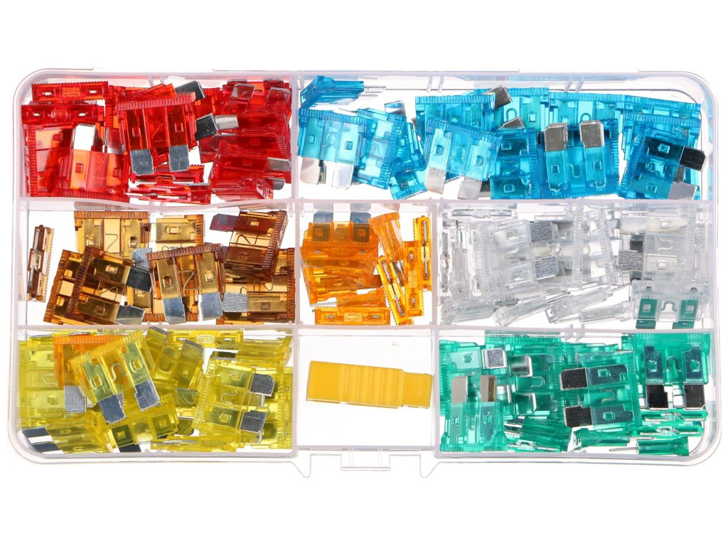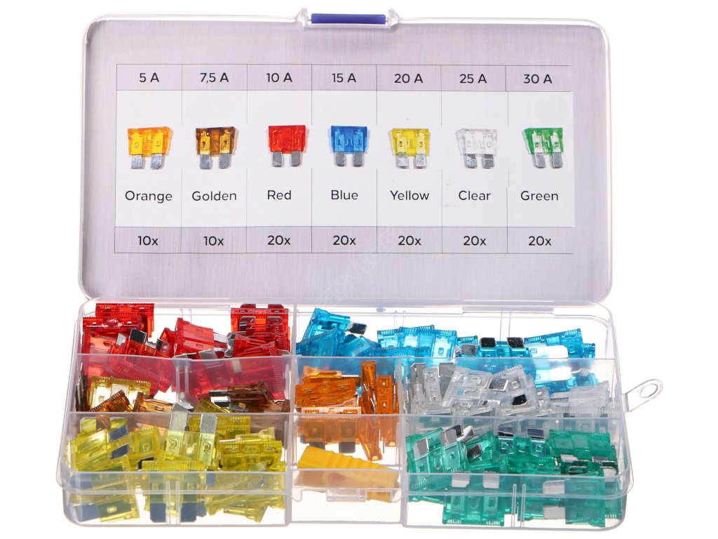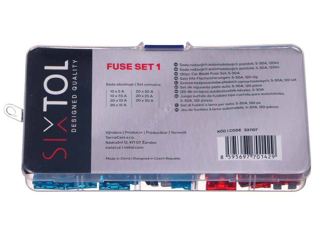 Praktická sada standardních automobilových pojistek SIXTOL FUSE SET 1, které najdou využití v každém běžném vozidle nebo motocyklu. Sada obsahuje 120 kusů nožových pojistek o jmenovitém výkonu od 5 do 30 A, které jsou rozlišeny různými barvami. Pojistky jsou vyrobeny v souladu s normou ISO8820. Každá pojistka je z horní strany označena příslušným jmenovitým proudem, aby bylo snadné pojistky rozlišit. Celá sada je uložena v praktickém plastovém pouzdru s přihrádkami.Obsah sady: